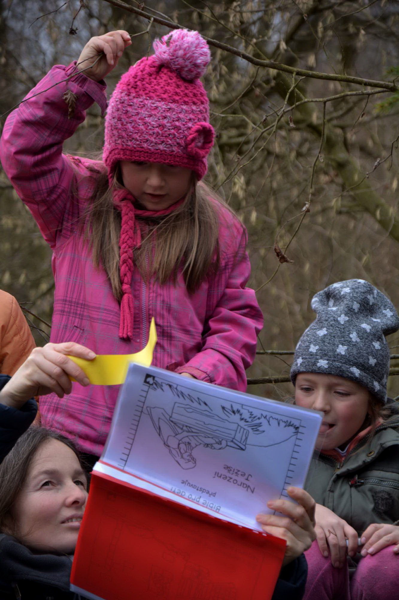 K úkolům beru pouze miminko (špalíček s obličejem zabalený v suché trávě) a pro každé dítě čelovku, kterou budou děti hledat jako hvězdu a kterou budou potřebovat k večernímu hledání dárků na zahradě. To bude to, co si z výpravy odnesou. Samozřejmě pokud nemáte v plánu dávat dětem nové čelovky, využijte nějaké vaše. Ostatní k úkolům mají děti najít v přírodě.